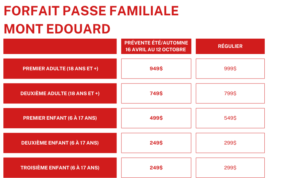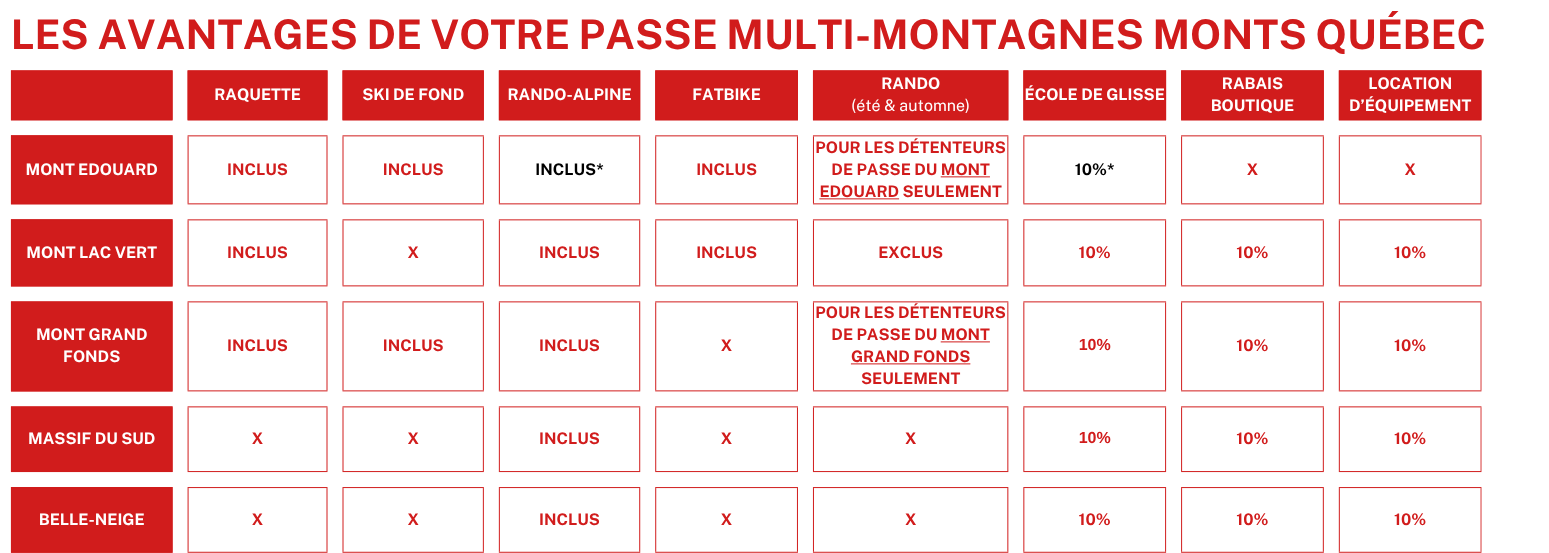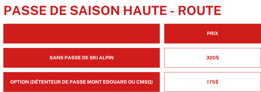 Nouveauté cette année deux choix de passe: le Mont Edouard seulement ou l’ensemble des montagnes de la Compagnie des Montagnes de Ski du Québec (CMSQ); la passe Monts Québec. Dans les deux cas, en ayant votre passe de saison vous pourrez profiter aussi du ski de fond, du fatbike et de la raquette sans achat supplémentaire! Envie de découvrir nos secteurs de l’arrière-pays? La passe haute-route est offerte en option lors du processus d’achat de la passe de saison.